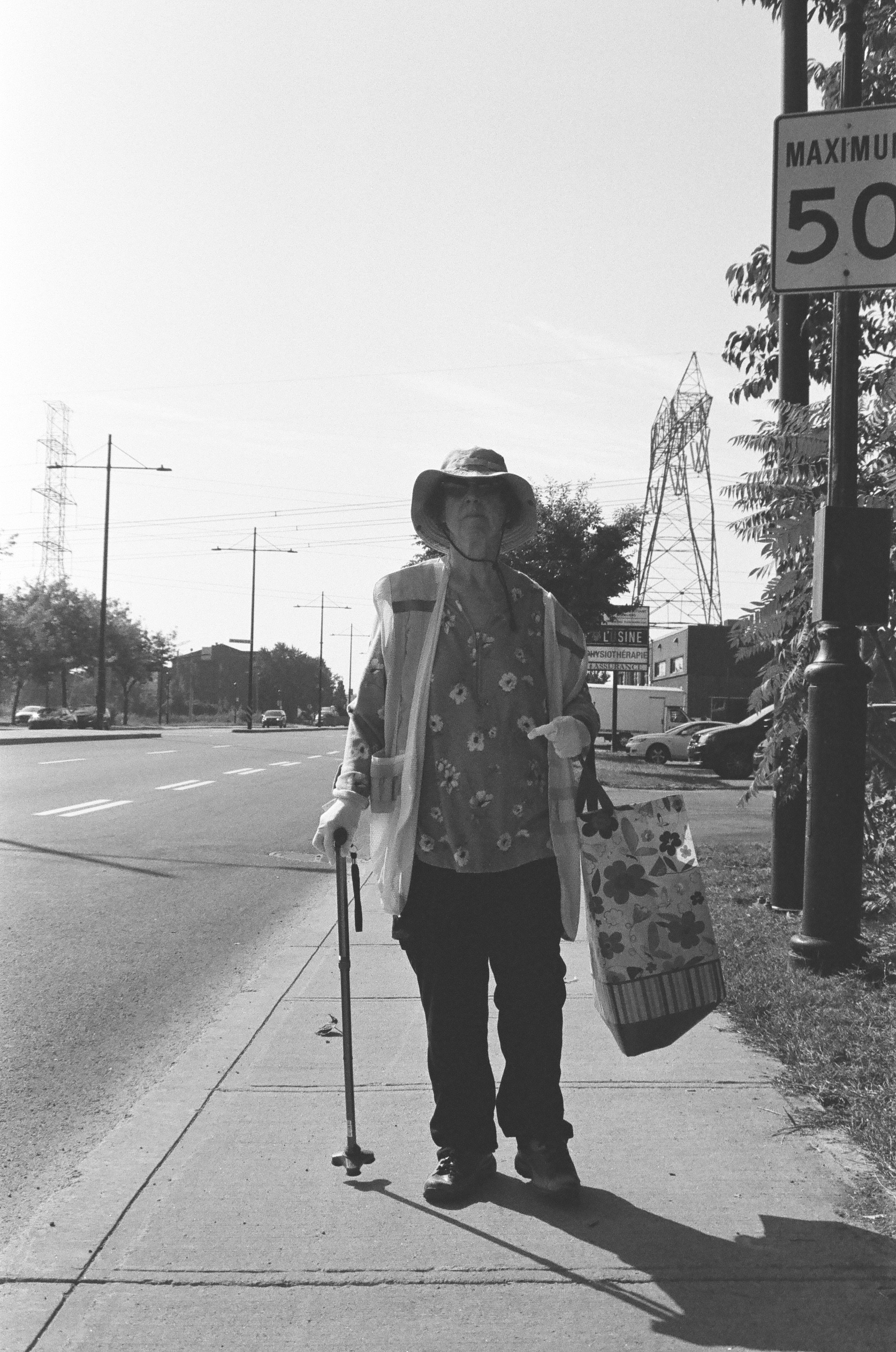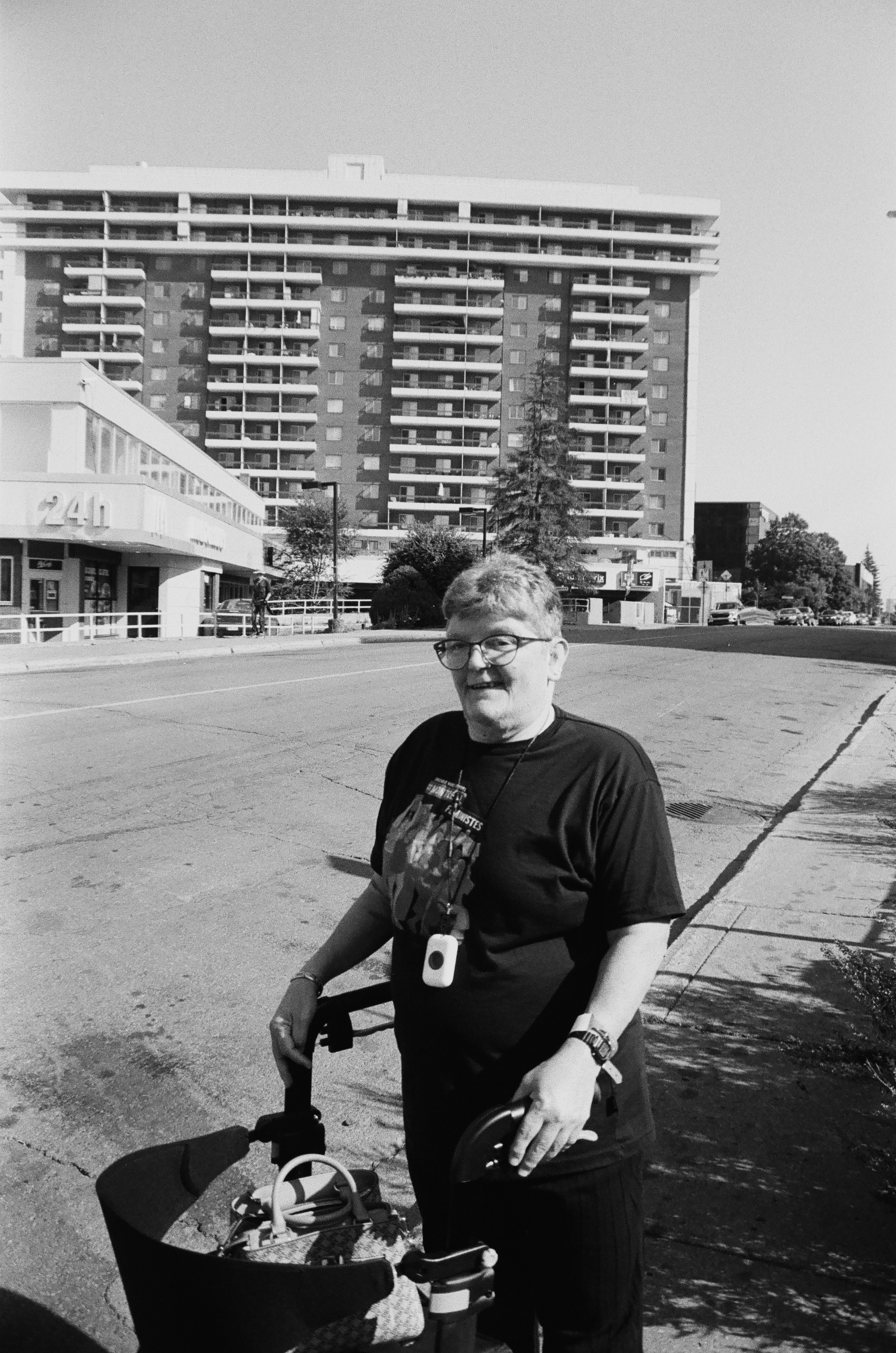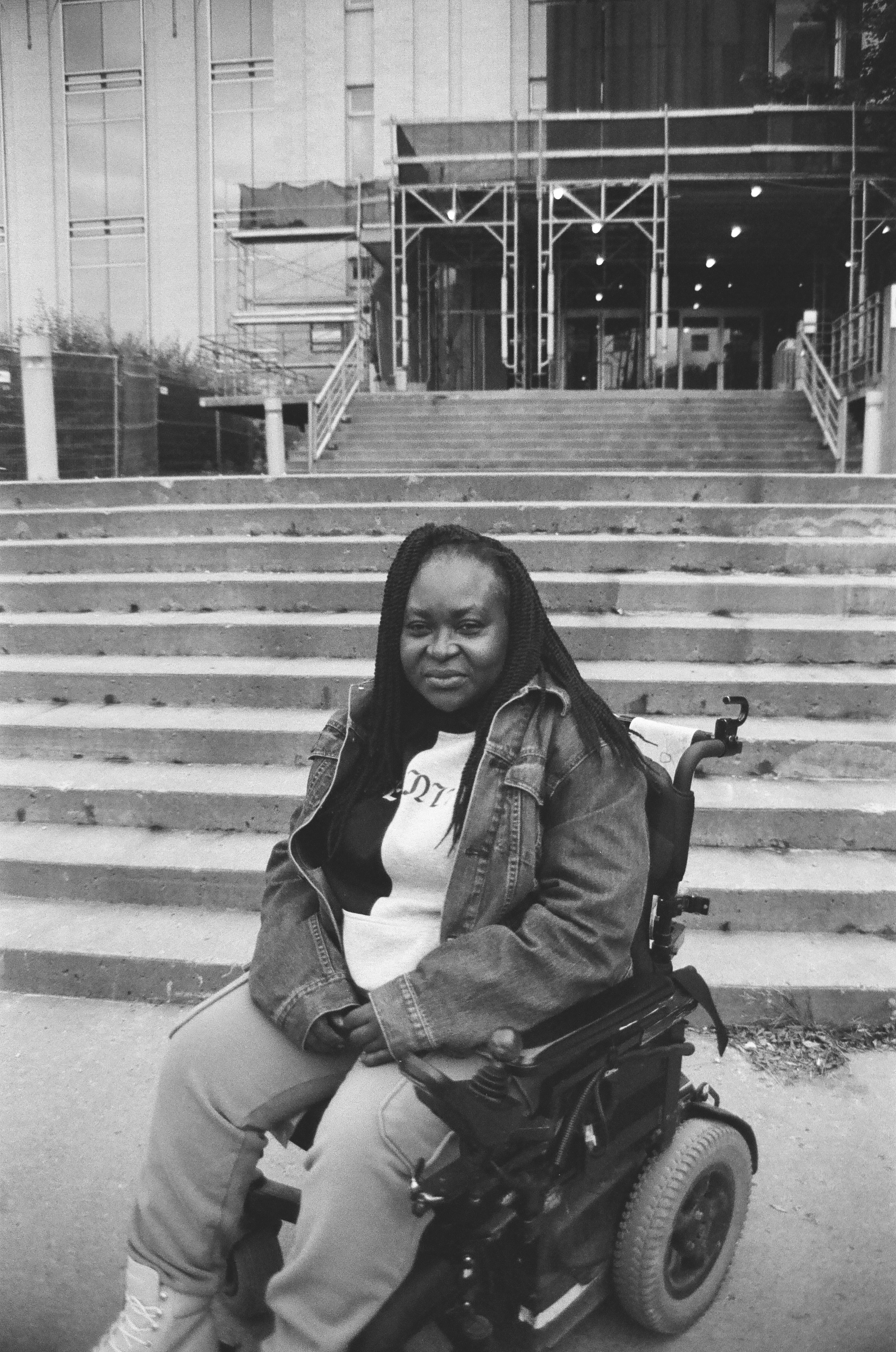 Above is a black and white filtered photo of the lived experience expert Celia. She is in a parking.