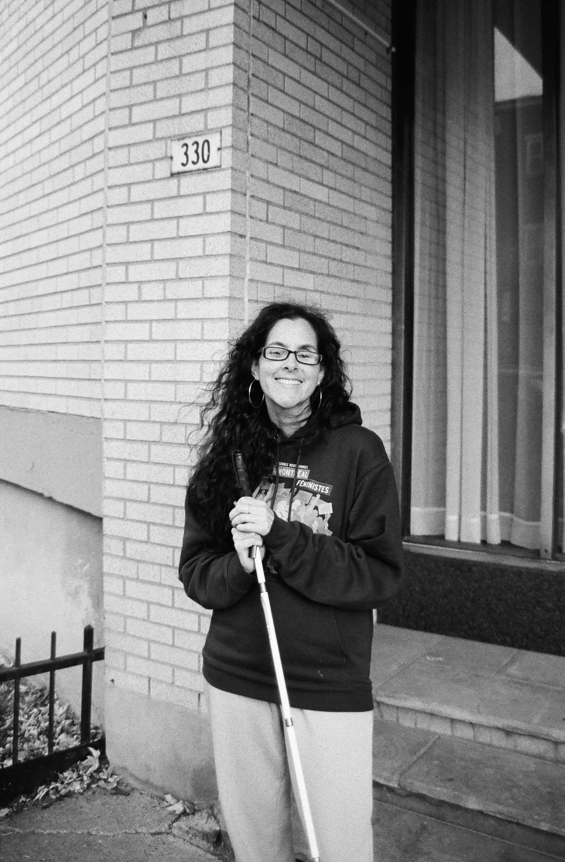 In this photo, we see Julie a lived experience expert. She is smiling and holding her white cane.